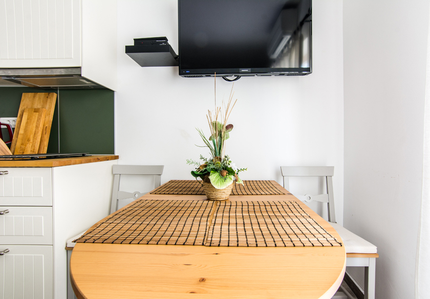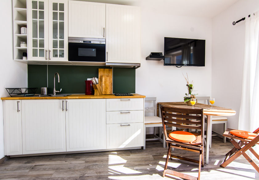 Elegantno uređen apartman koji se sastoji od dnevnog boravka sa kuhinjom, spavaće sobe i kupaone. Namijenjen za odmor dvije odrasle osobe + dvoje djece.